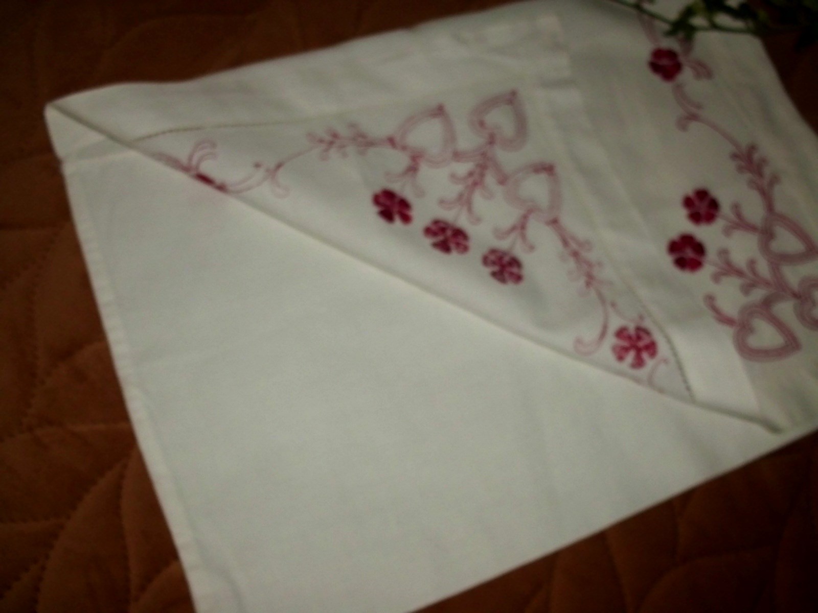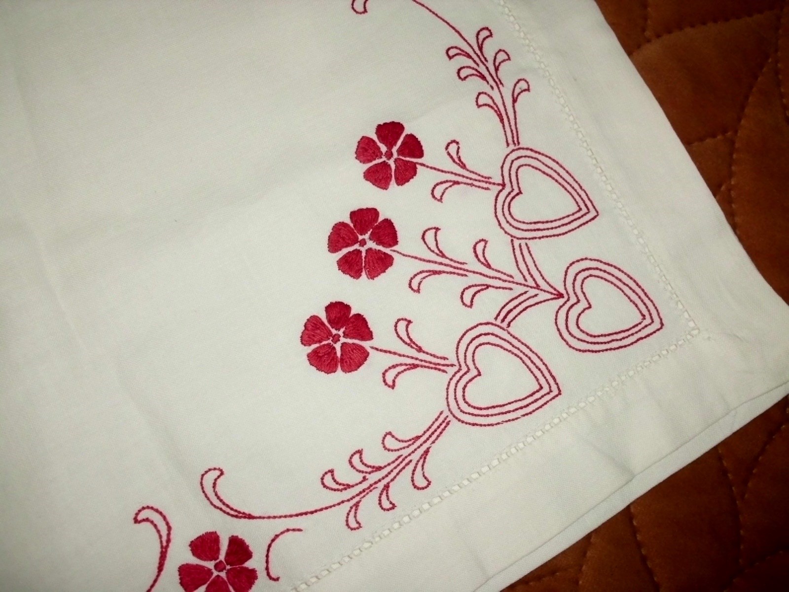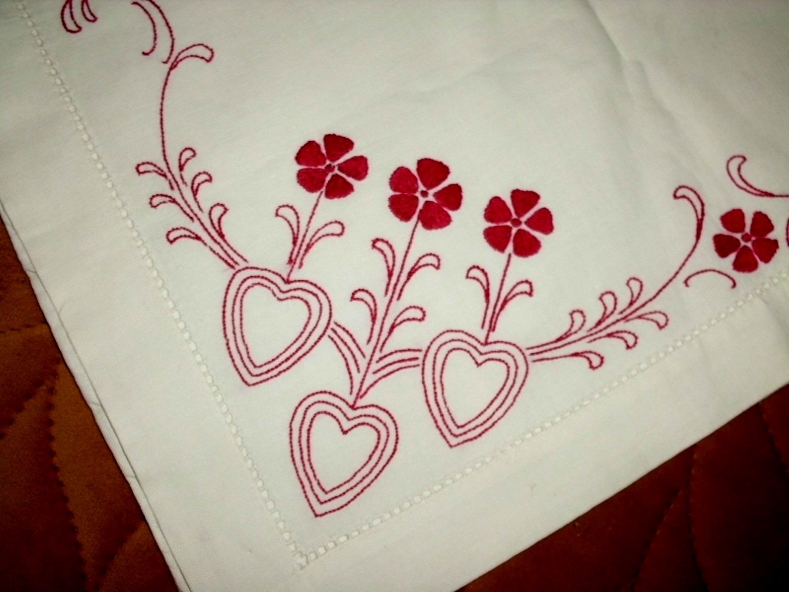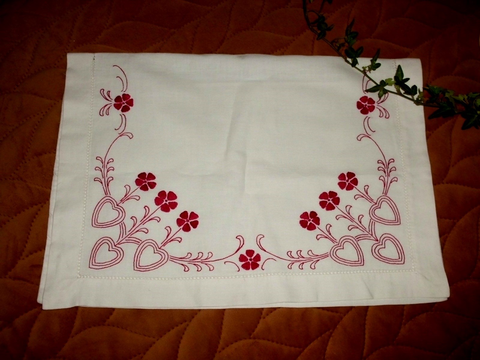 Finfina broderier i rött med hjärtan och blommor. Kantad runtom med hålsöm. Se gärna närbilderna.