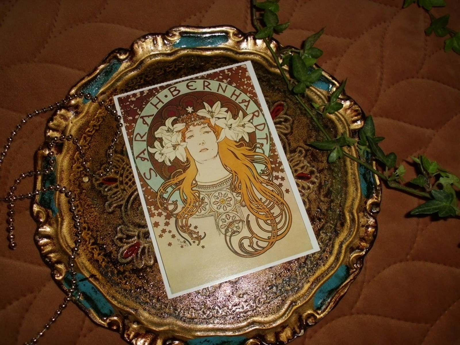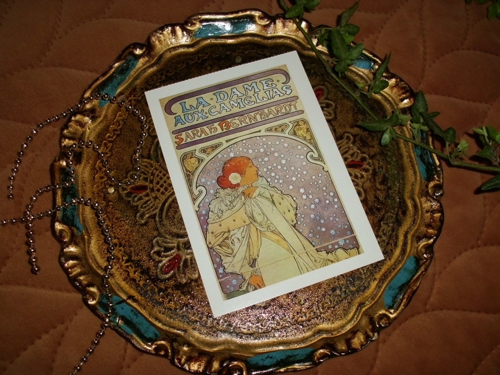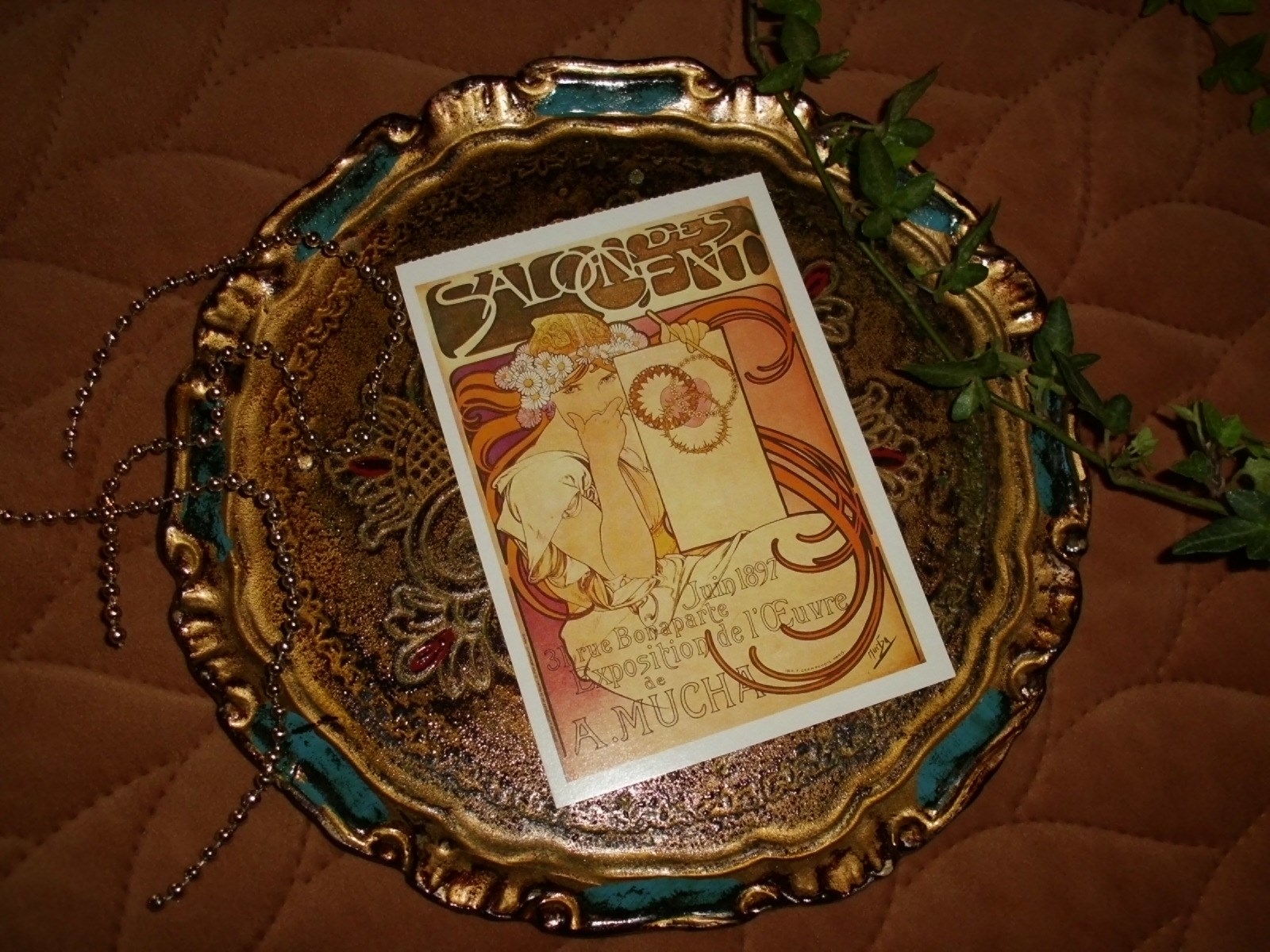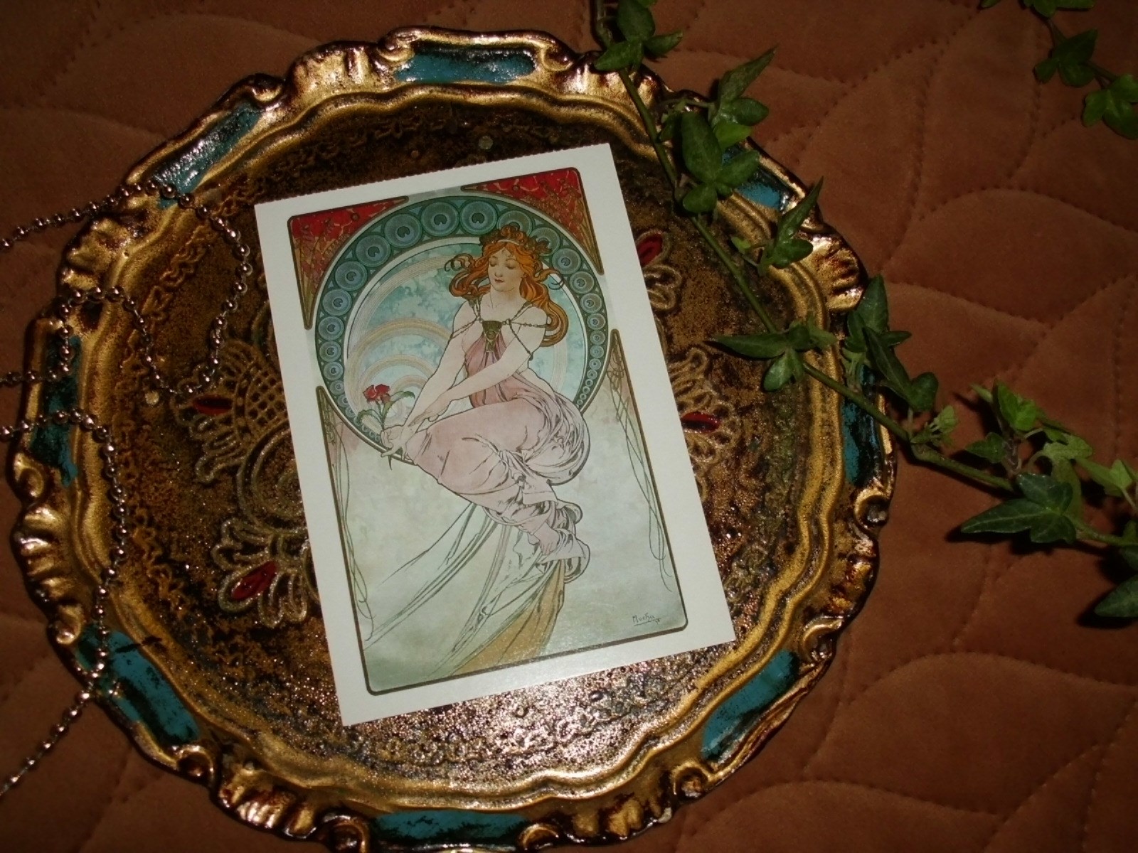 Vackert oanvänt VYKORT i jugend / art decostil. Design av Alphonse Mucha.